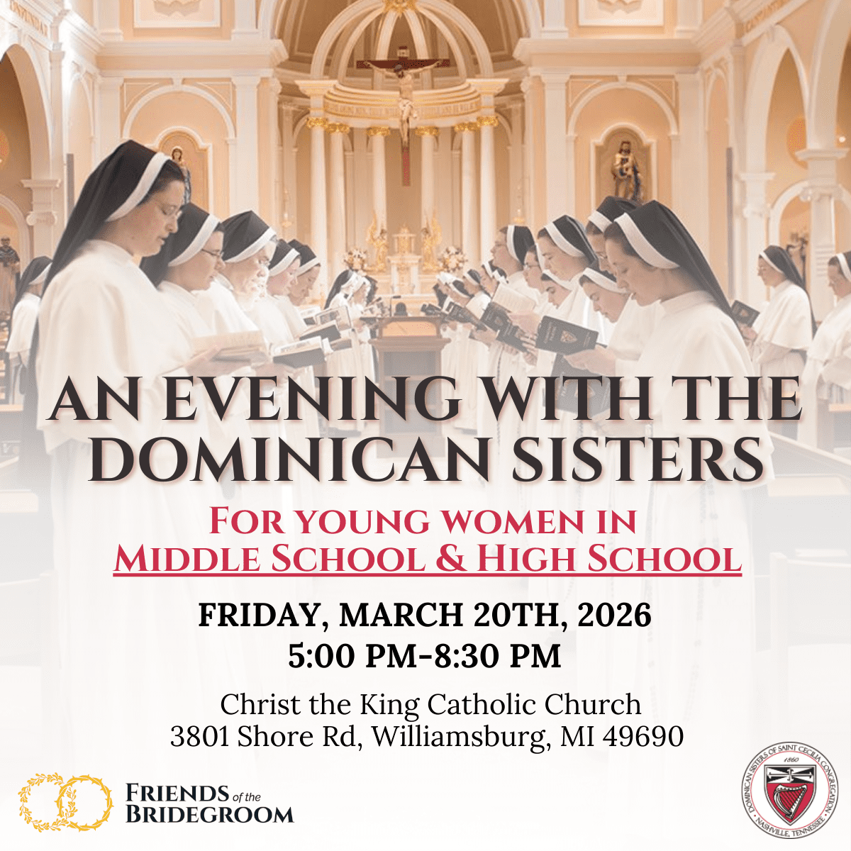 The evening will include Vespers, Dinner, a Talk (from the Nashville Dominicans Vocations Director), Q&A with the Sisters, Adoration & Confessions, Compline, & Benediction